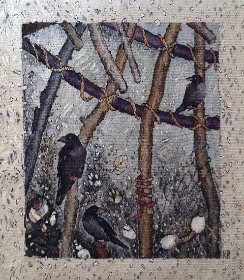 My process of designing a tapestry begins with a drawing that gives framework for the creative work on the loom. Only few lines are traced on a cartoon to guide weaving. The drawing is placed next to the loom. I use colours freely as I work, picking up new colours and stopping those in progress at will. I feel that I am having a dialogue between myself and the tapestry in progress when interpreting the image in yarn. I like the cool and shiny look of linen and use it as weft. I mix several threads together in a bobbin in order to get the colour I want.