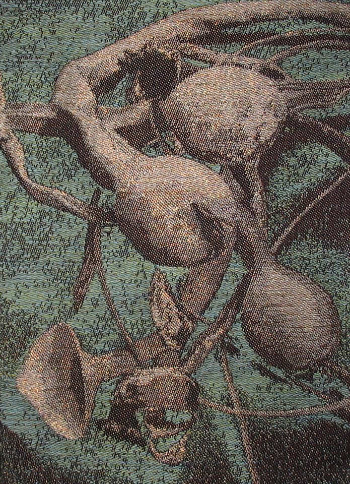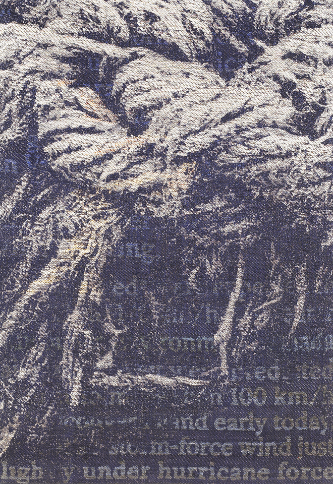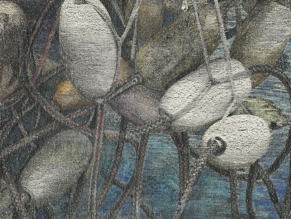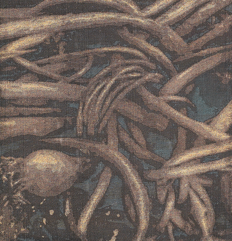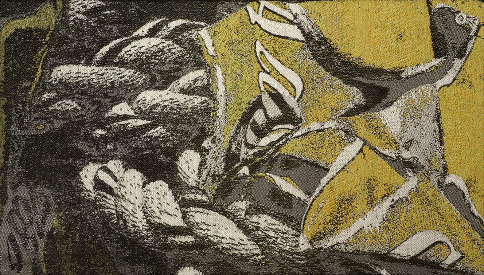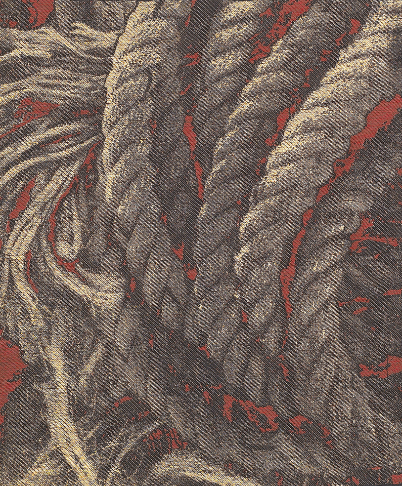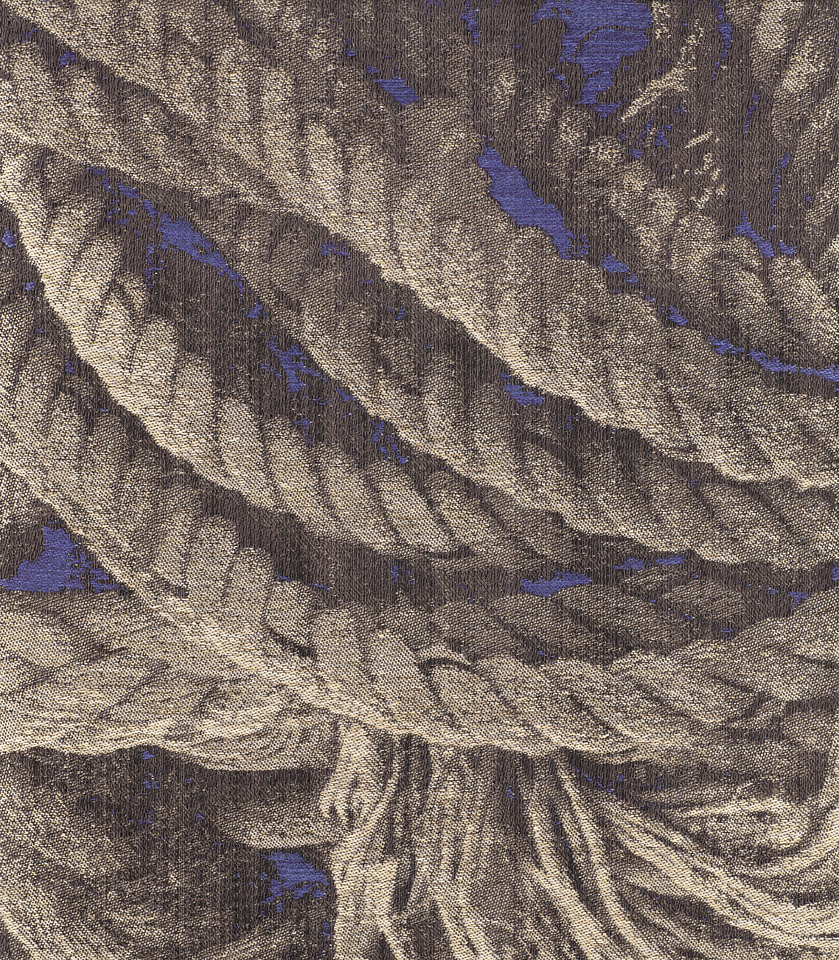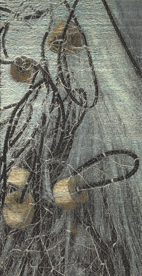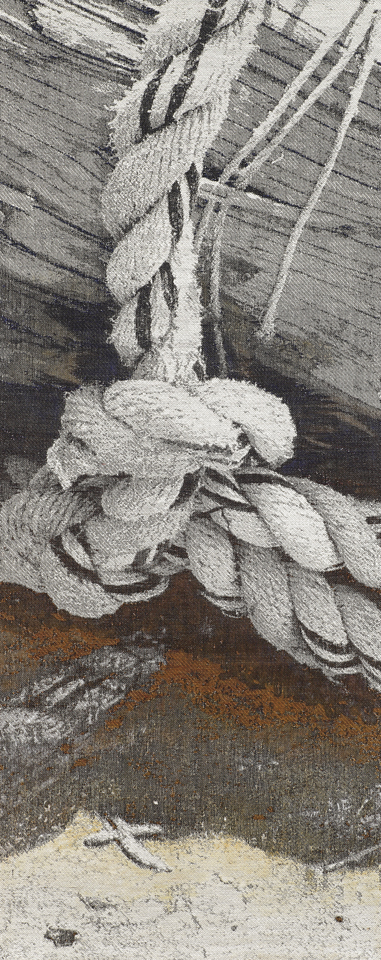 Inspired by the ropes that wash ashore along the British Columbia coastline, and the way their fibres unravel with weather and time, Kaija Rautiainen wove “Distant Passage”, a cropped and magnified view of an abstracted rope shape. The dramatic scale of this tapestry enhances the weightiness of this elegant rope.